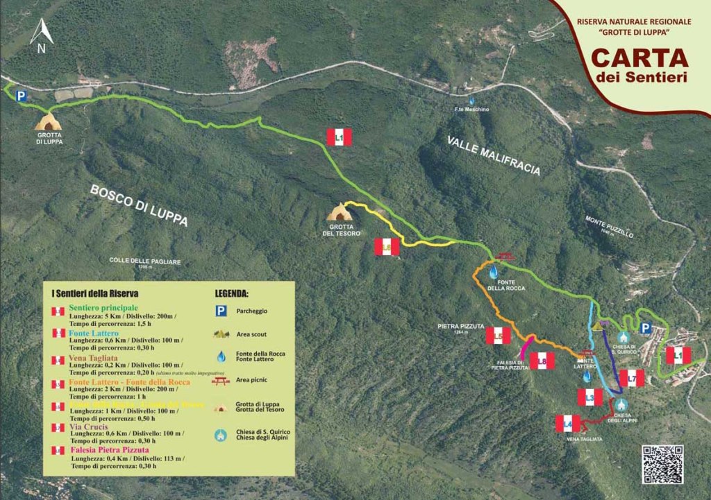 Per tutti i gusti è la Rete Sentieristica della Riserva Regionale Grotte di Luppa, che permette di assaporare a pieno le bellezze paesaggistiche e culturali della zona. Il Sentiero principale (L1), lungo 5 km, collega i due punti di accesso alla Riserva (a sud, località le Dolomiti; a nord, nei pressi dei Casali di Luppa): attraversa tutta l’area protetta e permette di raggiungere, con una piacevole passeggiata, l’ingresso dell’Inghiottitoio. Dal Sentiero principale si può imboccare il percorso (L3) che, da Fonte Lattero, ripercorrendo la via crucis, conduce al grazioso borgo di Tremonti, passando per la chiesetta degli Alpini. Dalla piazza di Tremonti, proseguendo, si potranno ammirare i resti dell’antico castello degli Orsini e magiche viste su tutta la valle, fino a giungere alla grotta della Madonna, in passato luogo di preghiera e devozione. Un’altra piccola deviazione dal Sentiero principale consente la vista della Grotta del Tesoro (L6). Molto suggestivo è il belvedere naturale in località Vena Tagliata (percorso L4): vi si giunge, partendo dalla chiesetta degli alpini, percorrendo prima un tratto del sentiero L1, poi uno di quello L3; bisogna fare attenzione all’ultimo tratto, essendo molto impegnativo ed esposto. Da uno dei principali fontanili della Riserva (Fonte Lattero), attraversando il bosco al cospetto della falesia di Pietra Pizzuta con le sue 22 vie di arrampicata c’è un’area bouldering per tutti quelli che voglio avvicinarsi a questa disciplina sportiva, seguendo il sentiero si raggiunge la Fonte della Rocca: qui, si potrà godere dell’acqua fresca e dell’ombreggiata area picnic (L5). La deliziosa zona dove rifocillarsi è segnalata anche da un cartello sulla via Tiburtina: si potrà, infatti, scegliere di fare una sosta, per un attimo di relax, sulla via del ritorno. Dal centro abitato (Piazza Municipio), un bel sentiero, dagli splendidi scorci panoramici (L2), permette di arrivare alla chiesa campestre di San Quirico, non distante dalla Fonte della Rocca (visitabile su richiesta) La Riserva offre, inoltre, numerosi luoghi dove potersi fermare, rilassarsi e mangiare qualcosa, tutti attrezzati con panche, tavoli e punti fuoco.